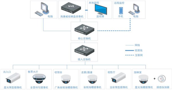 本方案覆蓋場景包括影院出入口、售票大廳、收銀臺、走廊、觀影廳、放映室等重要點位,主要采用??低暤娜释残蛿z像機、室內(nèi)全景特寫攝像機等監(jiān)控設(shè)備,實現(xiàn)24小時高清監(jiān)控、手機APP遠程實時預(yù)覽等功能,為糾紛等事件提供可靠證據(jù),保障影院設(shè)備財產(chǎn)安全和有序治安,提升觀眾觀影體驗和影院形象。